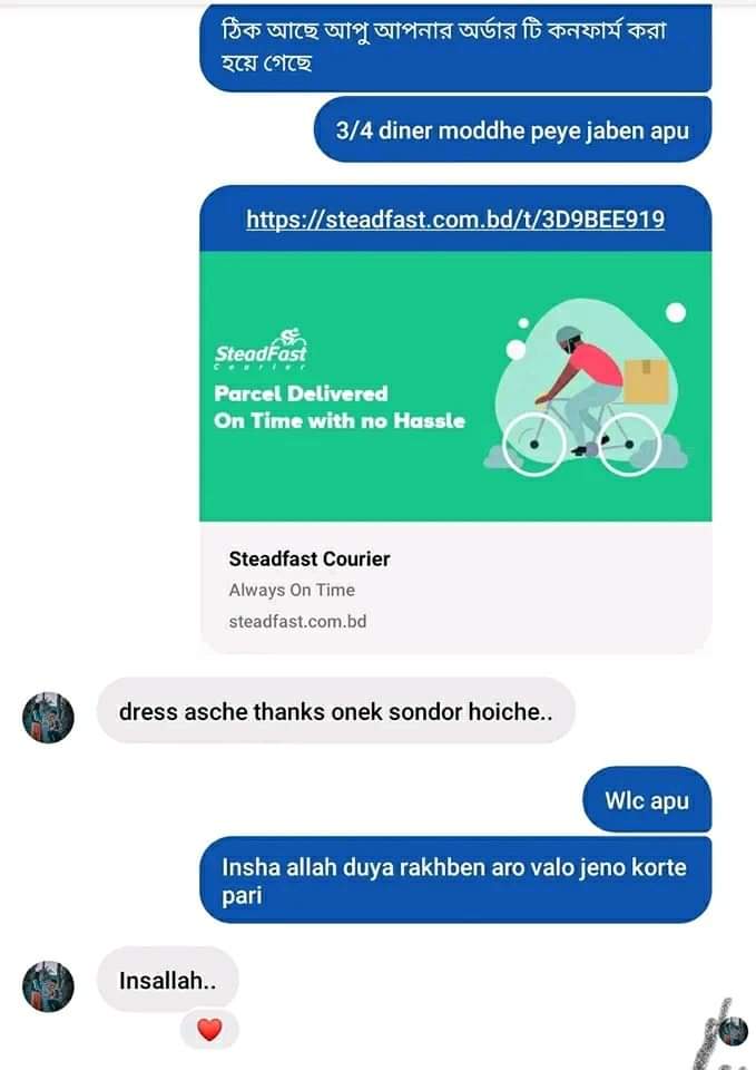 9আমরা দিয়ে থাকি সব চেয়ে কম প্রাইজের মধ্যে ভালো মানের ড্রেস 🥰আমাদের ড্রেস যারাই নিয়েছে তারাই আমাদের ড্রেসের সুনাম করেছে 😊আমাদের ড্রেসের রিভিউ দেখলে সেটা প্রমাণ হয়ে যায়👇যেকোনো সমস্যা আমরা খুব দ্রুত সমাধান করে থাকি✅ যে কোন সমস্যা হলে অবশ্যই আমাদেরকে মেসেঞ্জারে 📱অথবা আমাদের নাম্বারে📞 সরাসরি কন্টাক করে আমাদেরকে জানিয়ে দিতে পারেন✅ আমরা খুবই দ্রুত আপনাদের সমস্যার সমাধান করে দিবেন ইনশাআল্লাহ💞
